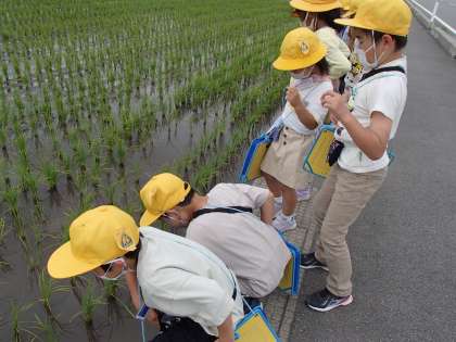 田んぼには、たくさんのおたまじゃくしが動き回っていて、子供たちは夢中になって観察していました。