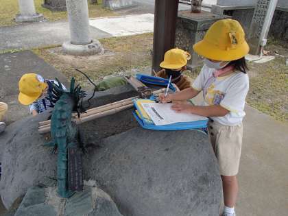 八幡社では、中沖の二上神社と比べながらすてき見付けをする子供たちもおり、「狛犬の顔が違う!こっちは全然こわくない!」等と話していました。