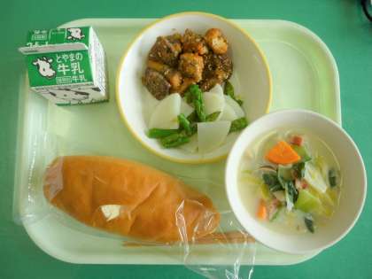 今日の給食は、米粉コッペパン、魚とレバーのえごまだれからめ、かぶのサラダ、中華クリームスープです。