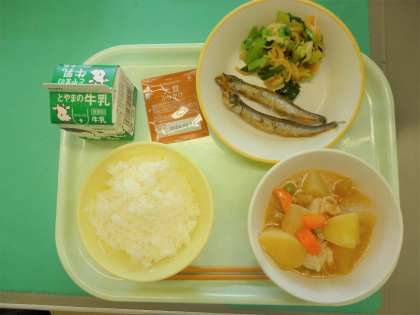 今日の給食は、ごはん、牛乳、ししゃものから揚げ、はりはり和え、豚肉とじゃがいものごま煮、大豆ふりかけです。