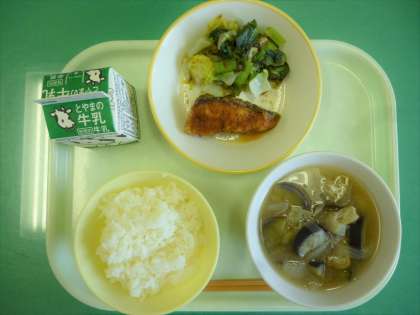 今日の給食は、ごはん、牛乳、揚げ魚のレモン味、とろろ昆布和え、なすのみそ汁です。