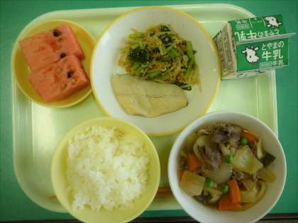 今日の給食は、ごはん、牛乳、肉じゃが、鰆の塩焼き、いり大豆和え、すいかです。