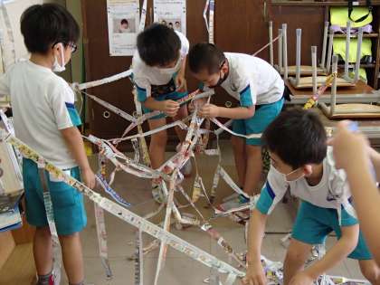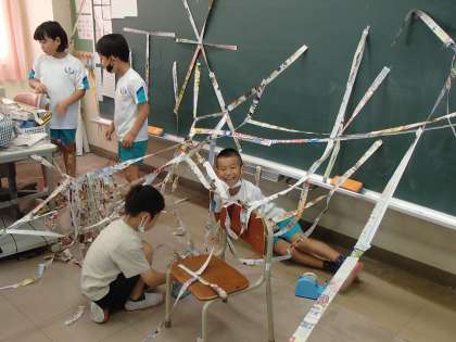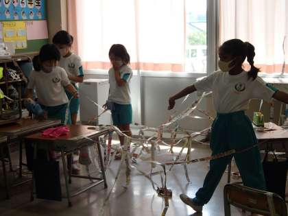 今日の図工の学習では、細長い紙を友達と協力して自由に繋げ、楽しい空間を作りました。子供たちは自由な発想で次々と紙をくっつけていき、教室は迷路のようになりました。後片付けまで、みんなで力を合わせて頑張りました。
