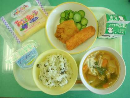 今日の給食は、わかめごはん、牛乳、★ポークパコラ、★いかフライ、きゅうりもみ、沢煮椀、☆ソーダゼリー、☆ブルーベリークレープです。今日は選択献立でした。