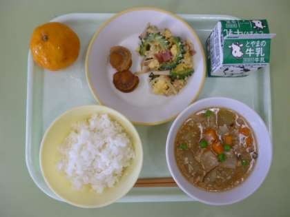 今日の給食は、ごはん、牛乳、冬瓜のそぼろあん、ほたての照焼き、ベーコンとゴーヤの卵炒め、冷凍みかんでした。
