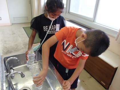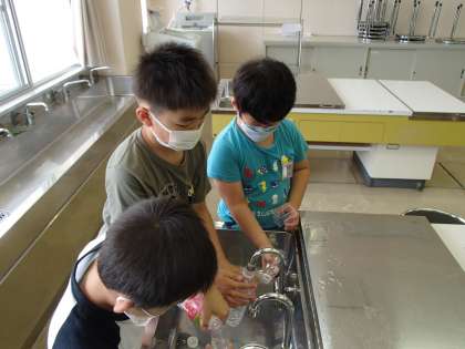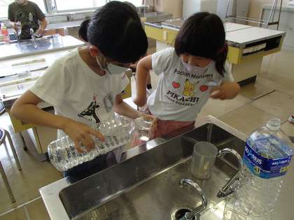 算数の時間に、子供たちが家から持ってきた容器に入る水のかさを調べました。