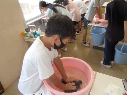 昨日の家庭科では、自分の靴下やハンカチを自分で手洗いしました。
