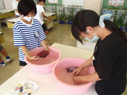昨日の家庭科では、自分の靴下やハンカチを自分で手洗いしました。