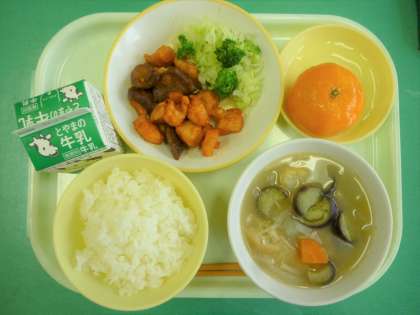 今日の給食は、ごはん、牛乳、鶏肉とレバーのケチャップからめ、添え野菜、なすのみそ汁、冷凍みかんです。