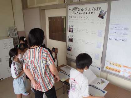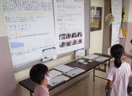 今日は1年生のみんなで、お兄さんお姉さんたちの夏休みの作品を見て回りました。じっくりと研究してあるもの、くふうをこらして製作してあるもの等、1年生の子供たちはびっくりで、おもしろい作品がたくさんありました。来年の一人一研究をする際のヒントになってくれていればよいなと思います。