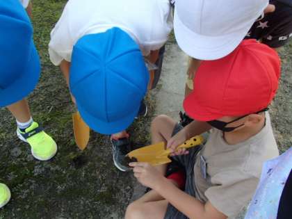 すみかが出来上がった後は、つかまえた生きものを入れ、とても嬉しそうでした。