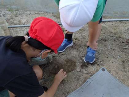 まずはすみか作りです。すみか作りに必要なものを家から持ってきた子どもたち。選んだ生きものが暮らしやすいすみかについて、調べたことを思い出しながら、土を入れたり草を入れたり、一生懸命準備をしていました。いろいろなえさを持ってきて、「どれを食べるかなあ」とわくわくしている様子も見られました。