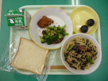 今日の給食は、食パン、ベーコンとひじきの和風スパゲッティ、照り焼きチキン、ビーンズサラダ、巨峰、牛乳です。