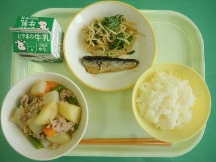 今日の給食は、ごはん、牛乳、いわしの土佐煮、ごま和え、豚肉とじゃがいもの南蛮煮です。