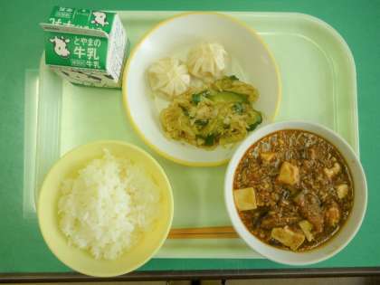 今日の給食は、ごはん、牛乳、マーボー豆腐、えびパオツ、バンサンスーです。