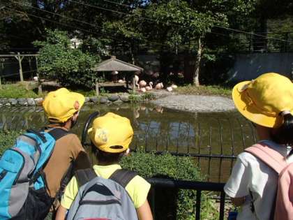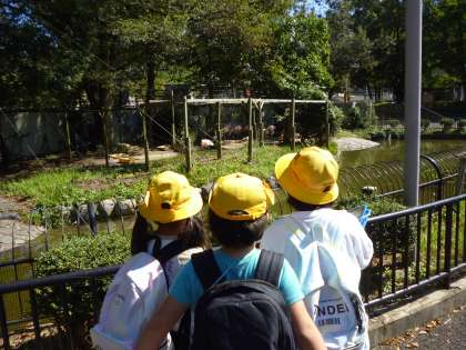 次の活動は園内の散策です。3〜4人の班に分かれ、班のみんなで決めたルートで園内を散策し、動物たちを観察しました。