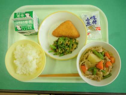 今日の給食は、ごはん、牛乳、はんぺんフライ、はりはり和え、肉じゃが、味付け小魚です。