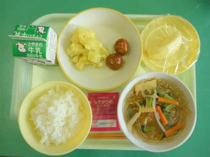 今日の給食は、ごはん、牛乳、ミートボール、チーズおさつ、春雨スープ、りんご、しそかつおふりかけです。