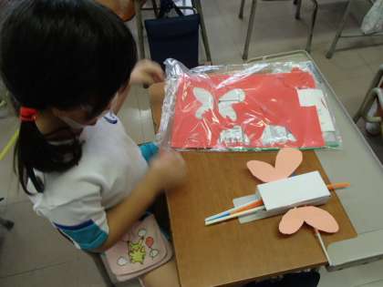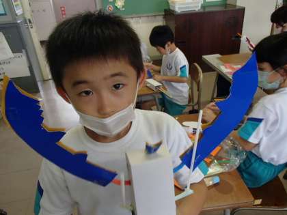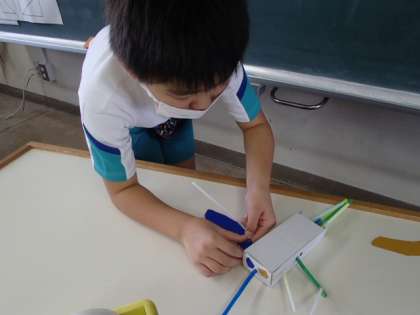 ストローと箱を使って、動く工作を作っています。動く部分をくわがたのつのにしたり、チョウの羽にしたりと、動きを確かめながらイメージに合う作品を一生懸命作っていました。