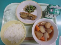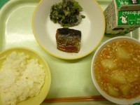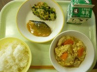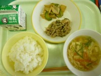 今日の給食は、ごはん、牛乳、厚焼き卵、もやしのおひたし、すき焼き、バナナです。