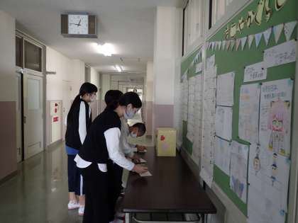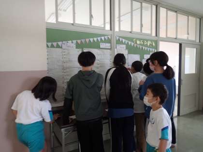 寒江っ子が応募した手洗いの標語とポスターを掲示しました。掲示板の前は作品を楽しむ子供たちでいっぱいです。