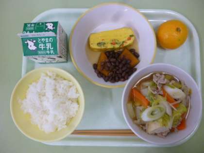 今日の給食は、ごはん、牛乳、千草焼き、かぼちゃのいとこ煮、はくさいなべ、みかんです。