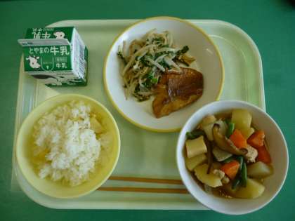 今日の給食は、栗おこわ、牛乳、赤魚の照り焼き、香味和え、筑前炊きです。