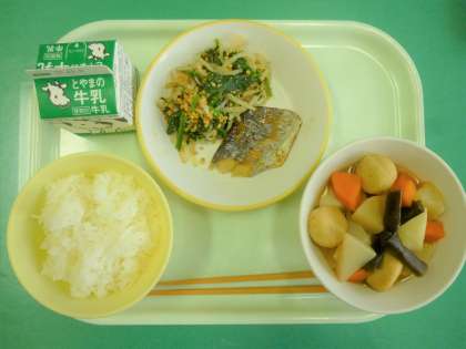 今日の給食は、ごはん、牛乳、鰆の幽庵焼き、いり大豆和え、おでんです。
