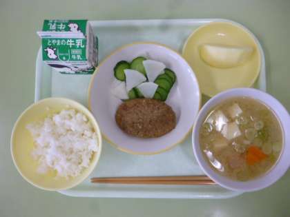今日の給食は、ごはん、牛乳、和風煮込みハンバーグ、きざみ和え、豆腐の味噌汁、りんごです。