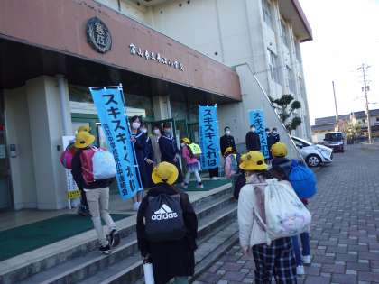 今日と明日は「スキスキ・くれは挨拶運動」が行われます。呉羽中の1年生と一緒に挨拶運動を行います。3月に寒江小を卒業した1年生が登校の途中に寄ってくれるのです。久しぶりになつかしい顔を見ることができました。にぎやかな挨拶運動となりました。