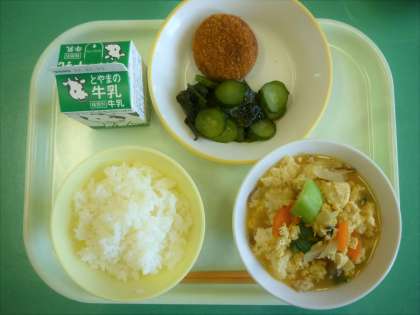 今日の給食は、ごはん、牛乳、里芋コロッケ、酢の物、炒り豆腐です。