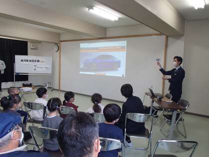 今日は寒江地区センターにお邪魔して、地域のお年寄りの方と一緒に、地域の企業の方のお話を聞いてきました。車のことについて、新しく知ったことがたくさんありました。最後には、お話のお礼にみんなで「さんぽ」を歌いました。