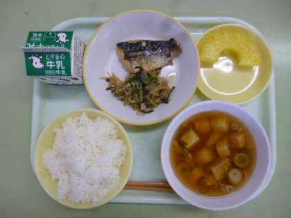 今日の給食は、ごはん、牛乳、さばの塩焼き、しらたきのピリ辛炒め、白玉汁、パインアップルです。