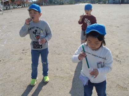 今日はサイエンスカー訪問があり、1・2年生は「シャボン玉遊び」をしました。