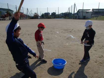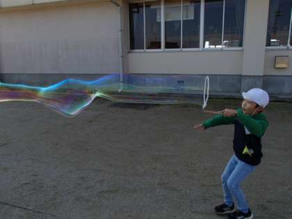 次に大きな輪っかをシャボン液につけてみました。少し動かすだけでとても大きなシャボン玉ができ、子供たちからは「すごい!」「こんなに長くなった!」等と、楽しい声がたくさん聞こえてきました。