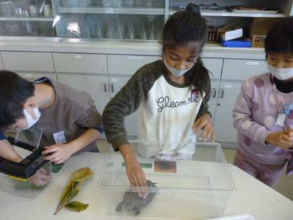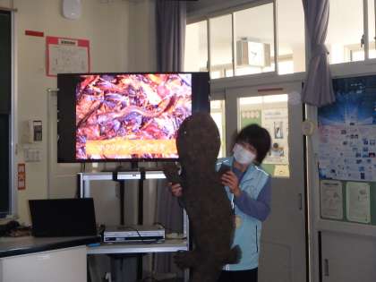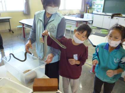 ファミリーパークの悠久の森出前授業がありました。講師の先生から呉羽丘陵に住む動物たちについて教えていただきました。そして、ホクリクサンショウウオやアオダイショウ、クサガメ、ヒキガエルなどの生き物をさわって触れ合いました。