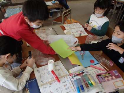 生活科の学習で「動くおもちゃ」を作る学習が始まりました。教科書にのっているおもちゃの中から、作ってみたい物を自分で一つ選んで活動しています。