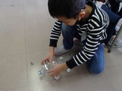 おもちゃは空気やゴムの力で動くのですが、作り方や動かす際の力の加え方等、様々なことが原因でうまく動かないという問題に直面しています。その都度、友達に相談したり、原因を考えながら工夫して作り直したりする姿がとても素晴らしいです。