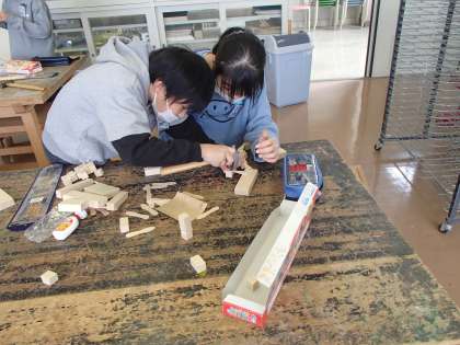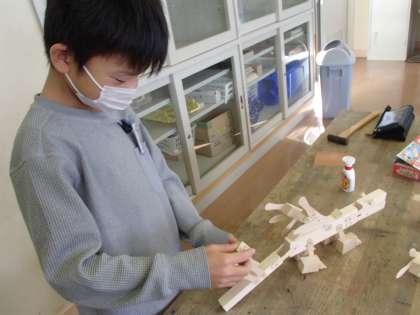 図工では、のこぎりやかなづちを使って、自由に生きものをつくっています。だんだん形になってきました。