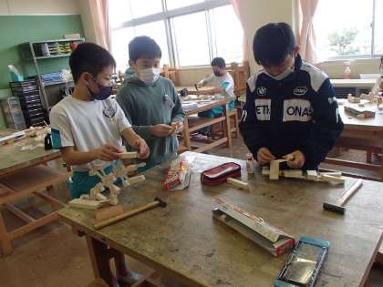 図工では、のこぎりやかなづちを使って、自由に生きものをつくっています。だんだん形になってきました。