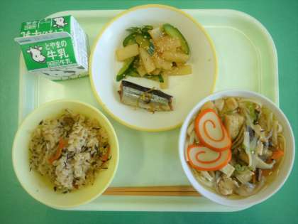 今日の給食は、ひじきごはん、牛乳、さんまの生姜味、華風和え、かしわうどんです。