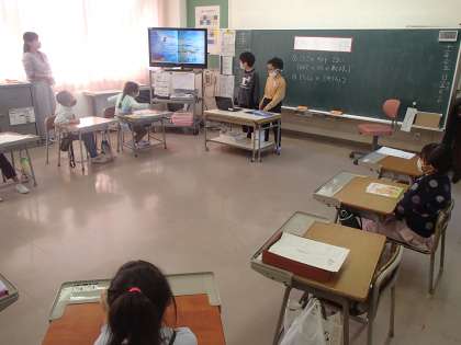 今日の読書タイムは、たんぽぽ級の二人が読み聞かせに来てくれました。スライドを使用して、見やすく、楽しく読み聞かせをしてくれました。おかげで、1年生がクスクスっと笑っていたり、楽しくて笑顔になったりしていました。さすが3年生さんですね!たんぽぽ級の二人、ありがとう。
