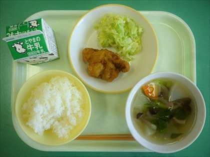 今日の給食は、ごはん、牛乳、ポークパコラ、ゆでキャベツ、かぶのスープです。