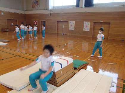 体育では、跳び箱の学習をしています。今日は、台上前転に挑戦しました。