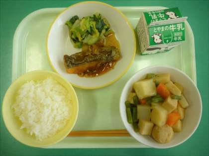 今日の給食は、ごはん、牛乳、魚の黒酢あん、白菜のひたし、関東だき