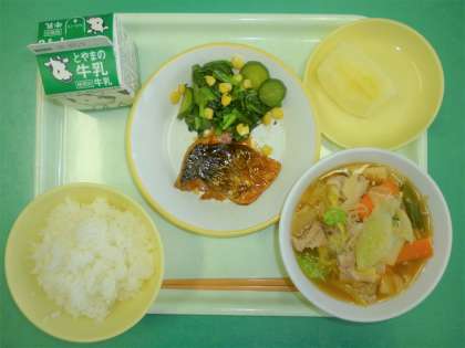 今日の給食は、ごはん、牛乳、あじのみりん焼き、コーン和え、豚肉と野菜の甘辛煮、りんごです。