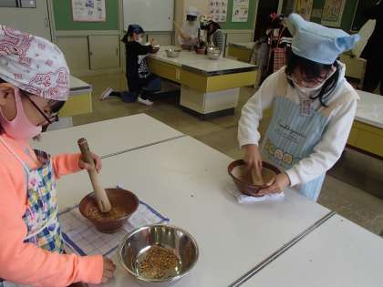 総合的な学習の時間には、収穫した大豆を使ってきなこ作りをしました。5年生が作るお餅と一緒に全校のみんなに振る舞うべく、一生懸命きなこ作りに取り組んでいます。