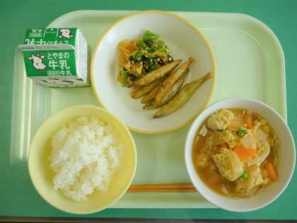 今日の給食は、ごはん、牛乳、きびなごのから揚げ、納豆和え、親子煮です。