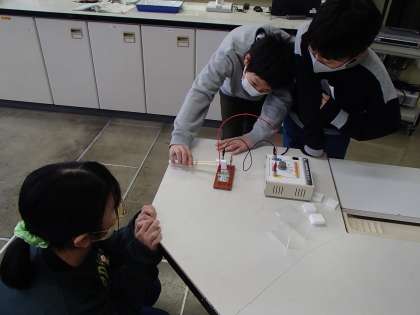 理科では、電熱線に電流を流すと発熱するか実験しました。