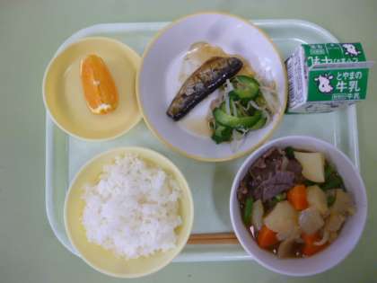 今日の給食は、ごはん、牛乳、いわしの梅煮、甘酢和え、肉じゃが、あいかです。